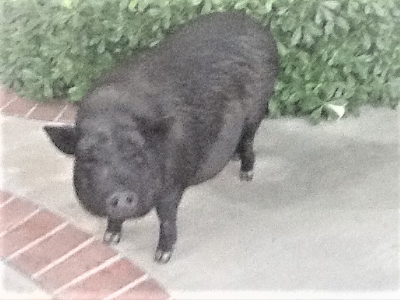 “I had BRILLIANT dogs. But, my domestic pig, Rocky, was so amazing; he became my awesome friend. He was housebroken within three days, and when he was hungry, he would bring me his dish and sit up, asking for dinner. I never taught him that.
